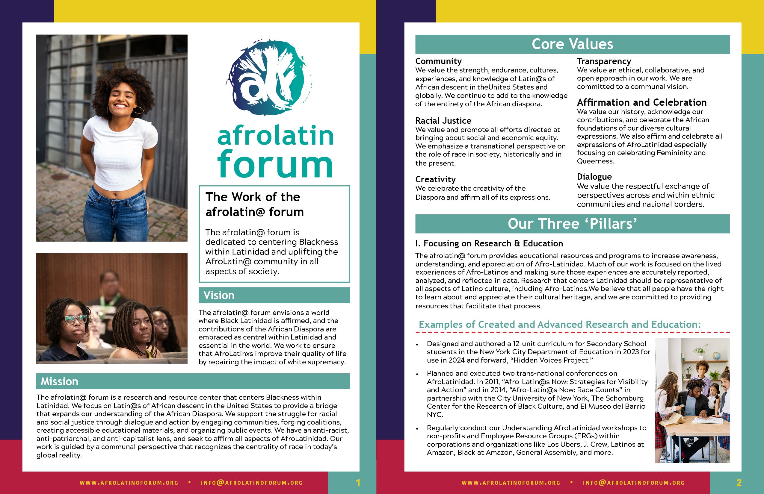 Objective: Help afrolatin@ forum create or update a one-page, and create a multiple page, fact sheet about the organization to get their who’s, what’s, why’s, and how’s all in one place.